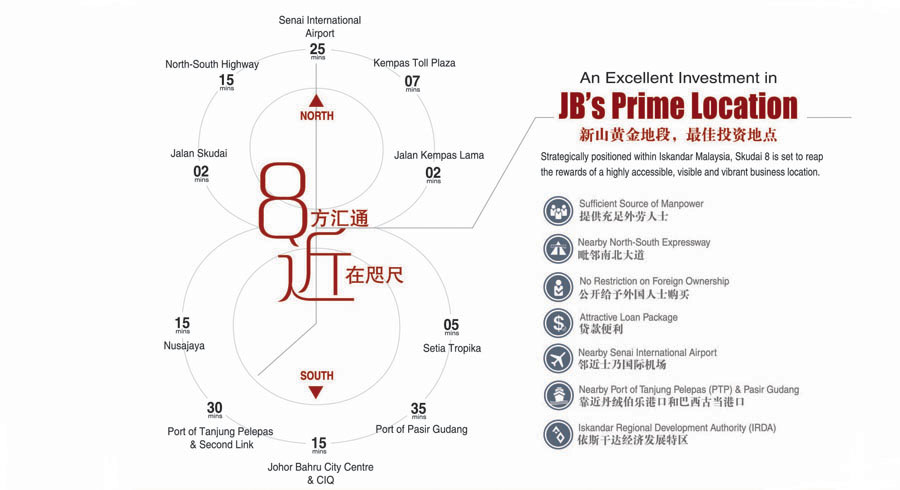 Easily accessible via many key roads, Skudai 8 is strategically located along Johor Bahru's major arterial highway – the Skudai Highway.